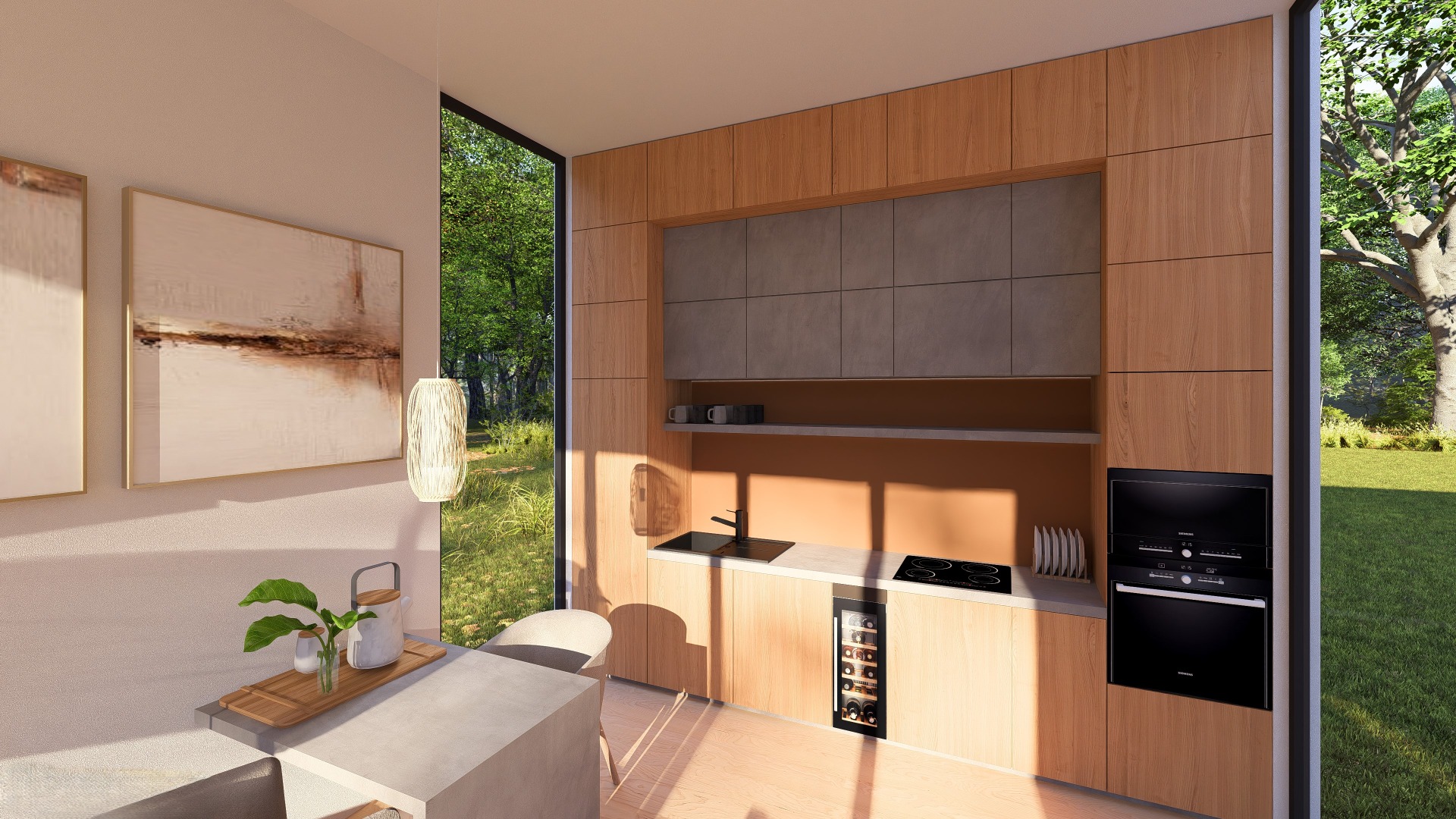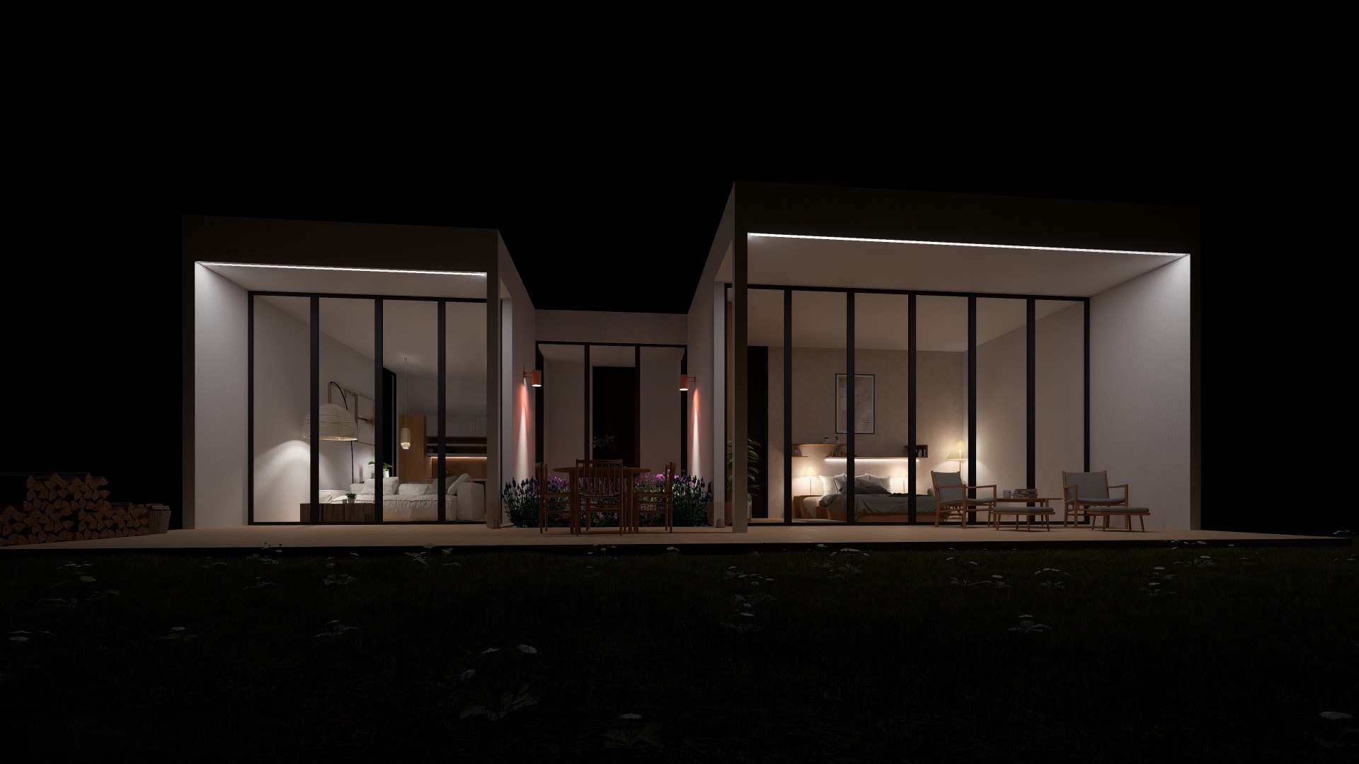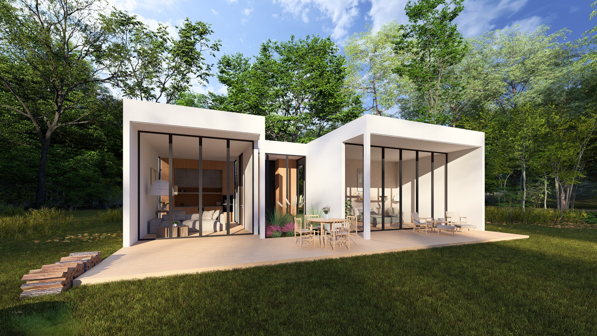 Vytvořili jsme místo, kde se čas zastaví. Tato studie rekreační chaty představuje dokonalou harmonii mezi surovostí moderních materiálů a teplem domova. Je to prostor navržený pro odpočinek, čtení knihy a splynutí s okolní zelení. Stěny s betonovou stěrkou vnášejí do prostoru moderní, industriální nádech a vizuální čistotu. Aby prostor nepůsobil chladně, je vyvážen velkým množstvím přírodního dřeva – od podlahy až po nábytek na míru. Celý koncept podtrhují černé matné detaily, které fungují jako grafický akcent a dodávají interiéru hloubku. Největším obrazem v interiéru je příroda sama. Díky velkým proskleným plochám vstupuje exteriér přímo do domu. V letních měsících se život přesouvá na velkorysou dřevěnou terasu. Ta je vybavena kvalitním nábytkem z dubového masivu, který odolá počasí a stárne do krásy spolu s domem.